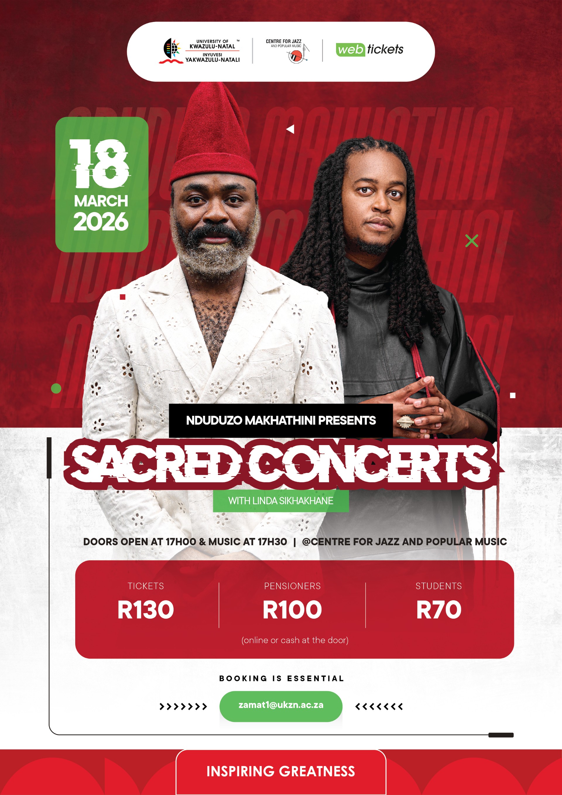 The Centre for Jazz and Popular Music proudly presents Nduduzo Makhathini Sacred Concerts featuring Linda Sikhakhane